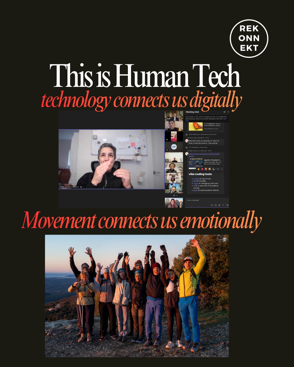 Rekonnekt brings the Human Tech philosophy to life by using technology to connect extraordinary people, while placing real human experiences, movement, and meaningful conversations at the centre of how leaders grow and build relationships. ♾️